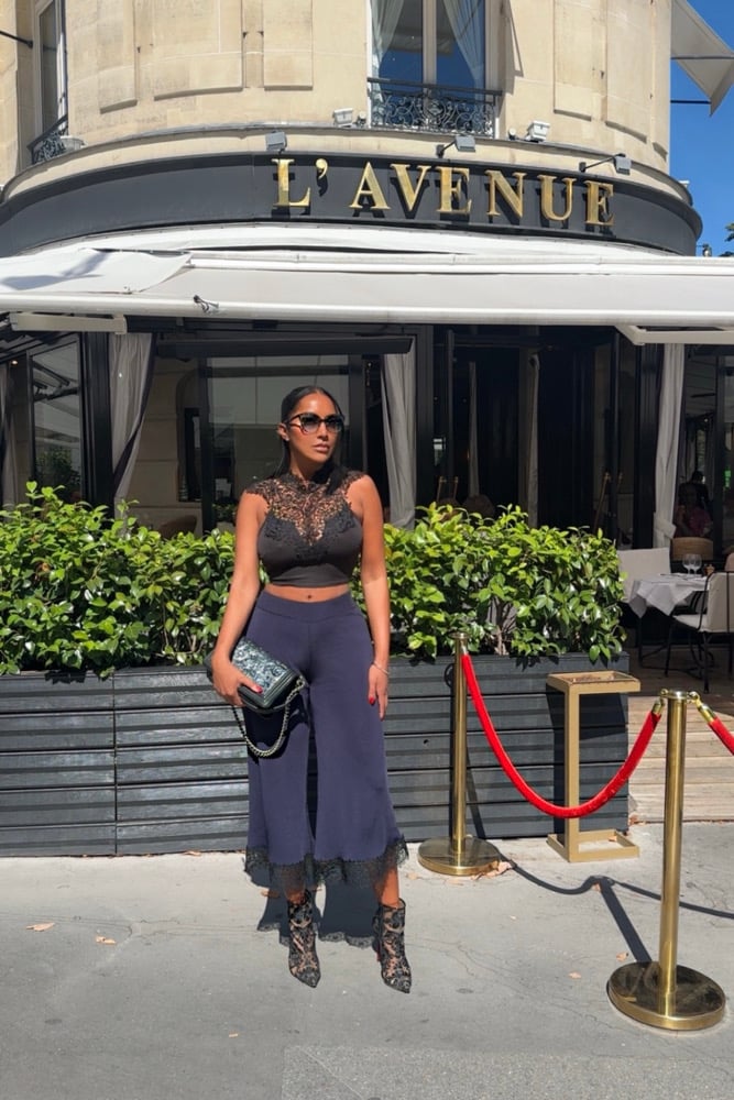 - NAVY BLUE GAUCO PANTS WITH LACE DETAIL - VERY STRETCHY - LACE DETAIL TOP WITH RIBBON TIE AT BACK OF NECK